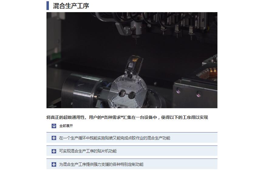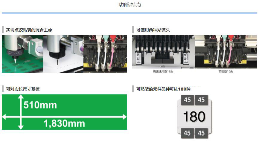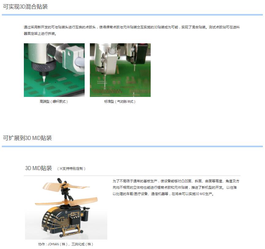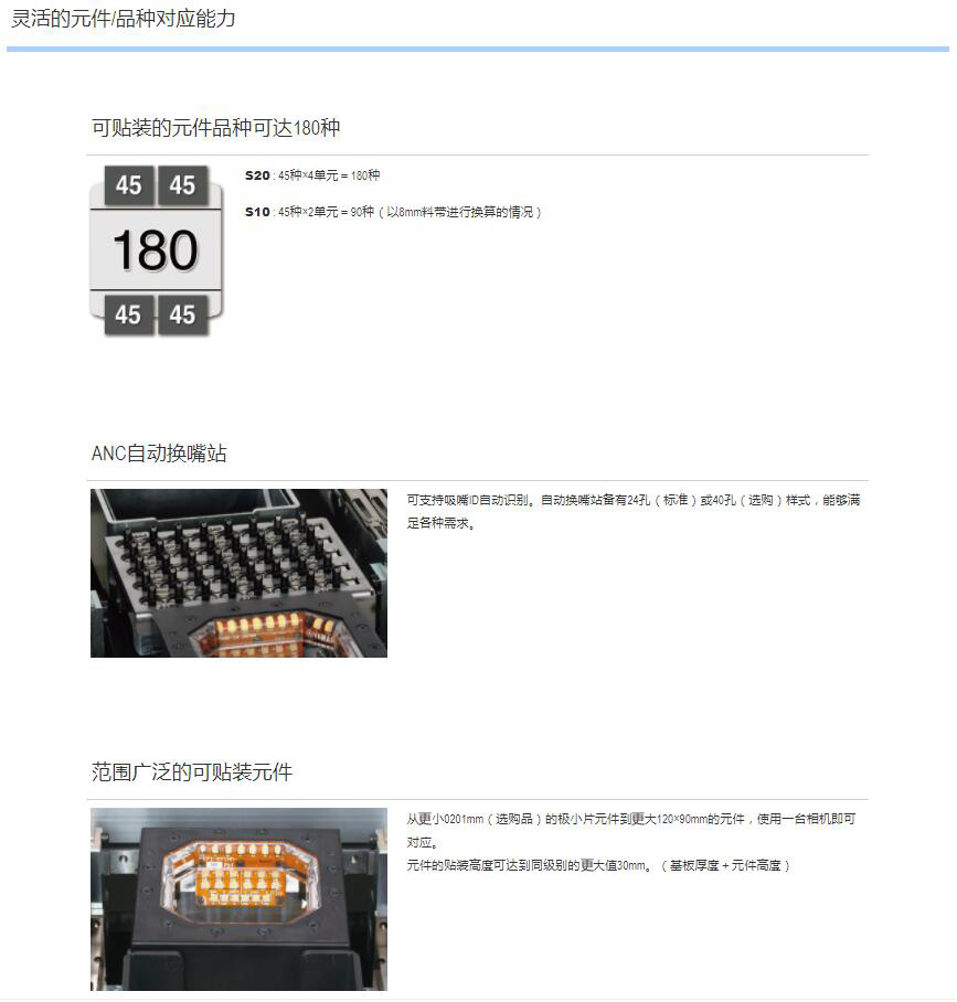 S10/S20 3D混合型模塊貼片機 1.可進行3D MID※貼裝,實現(xiàn)極致的通用性。2.可擴展到貼裝3D MID。3.強化基板應對能力。4.靈活的元件/ 品種應對能力。5.通用性極強的可切換性。※3D MID:三維模塑互連器件=Molded Interconnect Device